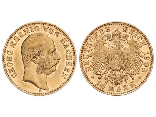 ESTADOS ALEMANES. 10 Mark. 1903-E. GEORG I. SAXONY. 3,97 grs. AU (900). Leves restos de brillo original. Fr-3847; KM-1259. EBC-.