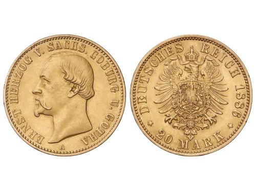 ESTADOS ALEMANES. 20 Mark. 1886-A. ERNST II. SACHSEN (Saxe-Coburg-Gotha). 7,91 grs. AU (900). (Pequeñas marquitas). RARA. Fr-3852; KM-148a. (EBC-).