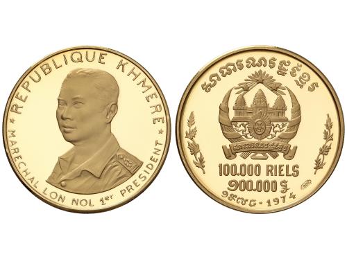 CAMBOYA. 100.000 Riels. 1974. 13,37 grs. AU (900). Presidente Lon Nol. MUY RARA. Fr-7; KM-66. Tirada: 100 piezas. PROOF.