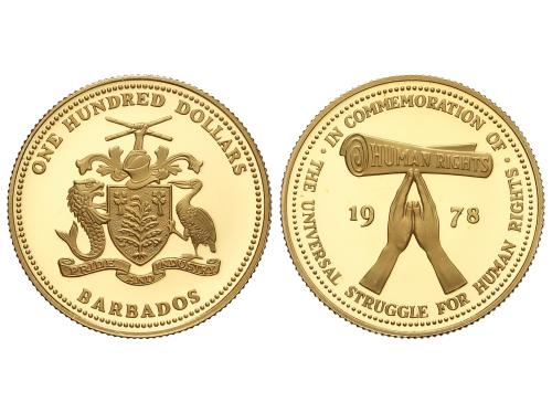 BARBADOS. 100 Dollars. 1978. 5,01 grs. AU (900). Declaración de los derechos humanos: manos rezando y documento. RARA. Fr-3; KM-28a. Tirada: 1.114 piezas. PROOF.