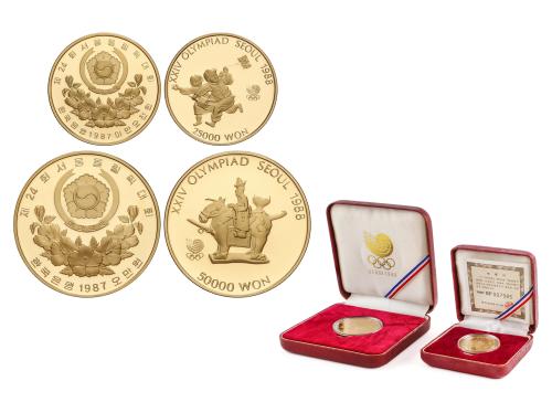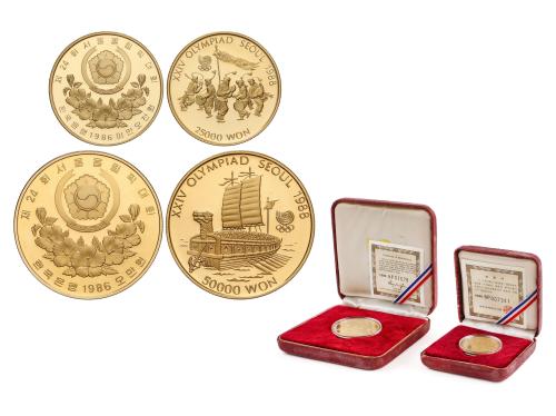 COREA DEL SUR. Lote 2 monedas 25.000 y 50.000 Won. 1986. 16,81 y 33,54 grs. AU (925). Serie I. Juegos Olímpicos Seúl´88: Danza folclórica y Barco Tortuga. En estuches originales, con certificado. Fr-7, 11; KM-58, 59. PROOF.