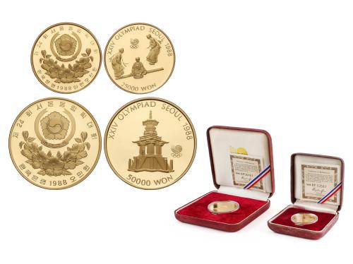 COREA DEL SUR. Lote 2 monedas 25.000 y 50.000 Won. 1988. 16,81 y 33,62 grs. AU (925). Serie IV. Juegos Olímpicos Seúl´88: Balancín y Templo Pul Guk. En estuches originales, con certificado. Fr-10, 14; KM-72, 73. PROOF.