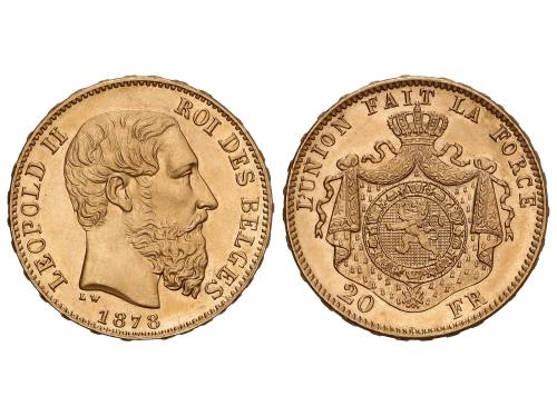 BÉLGICA. 20 Francs (20 Frank). 1878. LEOPOLD II. 6,44 grs. AU (900). Brillo original. Fr-412; KM-37. EBC/EBC+.