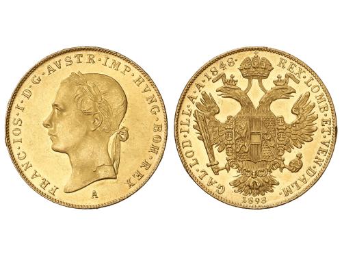 AUSTRIA. Ducat. 1848/1898-A. FRANZ JOSEPH I. VIENNA. 3,49 grs. AU (986). Golden Jubilee. 50 aniversario de la coronación del rey Francisco José I. (Ínfimas marquitas). Bella con pleno brillo original. Fr-489; KM-2268. EBC+/SC-.