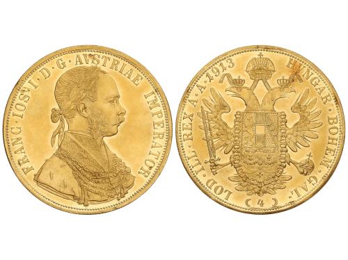AUSTRIA. 4 Ducat. 1913. FRANZ JOSEPH I. 13,96 grs. AU (986). Acuñación de época. (Original Strike). (Pequeñas rayitas y golpecitos en gráfila). Brillo original tipo PROOF. Fr-487; KM-2276. SC-.
