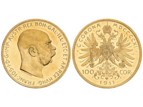 AUSTRIA. 100 Corona. 1911. FRANZ JOSEPH I. 33,85 grs. AU (900). Acuñación de época. Original Strike. (Leves rayitas). Brillo original tipo PROOF. Fr-507; KM-2819. Tirada: 11.165 piezas. EBC+/SC-.