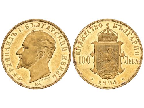 BULGARIA. 100 Leva. 1894-KB. FERDINAND I. KREMNITZ. 32,26 grs. AU (900). Una de las piezas europeas modernas de oro más deseadas. Acuñada en tirada muy baja y extraordinariamente rara en esta calidad. (Pequeñas marquitas en el campo, habituales en este tipo de moneda). Pleno brillo original. RARÍSIMA Y MÁS ASÍ. Fr-2; KM-21. Tirada: 2.500 piezas. EBC+/SC- Prooflike.
