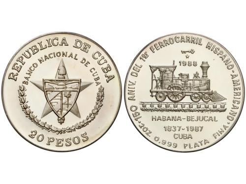 CUBA. 20 Pesos. 1988. 62,21 grs. AR. Primer ferrocarril Cubano. 2 Onzas de plata. RARA. KM-232. Tirada: 1.000 piezas. PROOF.