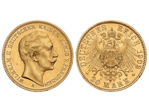 ESTADOS ALEMANES. 20 Mark. 1902-A. WILHELM II. PRUSSIA (Berlin). 7,93 grs. AU (900). (Leves golpecitos en anverso). Fr-3831; KM-521. MBC+/EBC-.