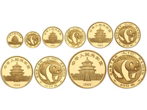 CHINA. Serie 5 monedas 5 a 100 Yuan. 1983. Peso total de 59,09 grs. AU (999). Serie Panda. ESCASAS Y MÁS EN SERIE. Fr-B4/B8; KM-68/72. Tirada 100 Yuan: 3.500 piezas. PROOF.