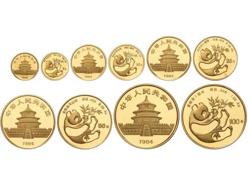 CHINA. Serie 5 monedas 5 a 100 Yuan. 1984. Peso total de 59,22 grs. AU (999). Serie Panda. ESCASAS Y MÁS EN SERIE. Fr-B4/B8; KM-86/91. Tirada 100 Yuan: 3.500 piezas. PROOF.