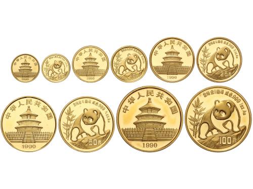 CHINA. Serie 5 monedas 5 a 100 Yuan. 1990. Peso total de 59,10 grs. AU (999). Serie Panda. ESCASAS Y MÁS EN SERIE. Fr-B4/B8; KM-268/272. Tirada 100 Yuan: 3.500 piezas. PROOF.