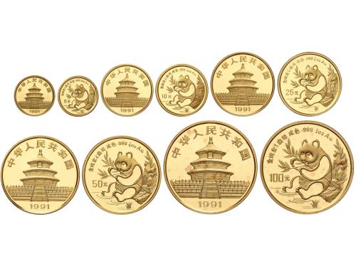 CHINA. Serie 5 monedas 5 a 100 Yuan. 1991. Peso total de 59,13 grs. AU (999). Serie Panda. ESCASAS Y MÁS EN SERIE. Fr-B4/B8; KM-346, 347, 349, 350, 359. Tirada 100 Yuan: 3.500 piezas. PROOF.