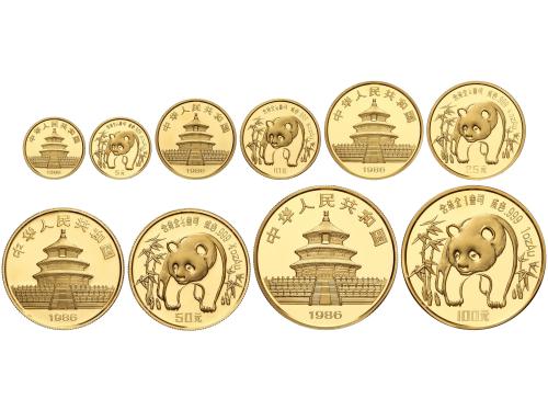 CHINA. Serie 5 monedas 5 a 100 Yuan. 1986. Peso total de 59,12 grs. AU (999). Serie Panda. ESCASAS Y MÁS EN SERIE. Fr-B4/B8; KM-131/135. Tirada 100 Yuan: 3.500 piezas. PROOF.