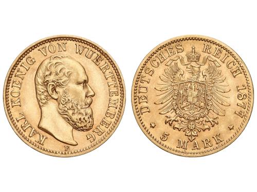 ESTADOS ALEMANES. 5 Mark. 1877-F. KARL I. WURTTEMBERG. 1,99 grs. AU (900). Fr-3875; KM-627. EBC.