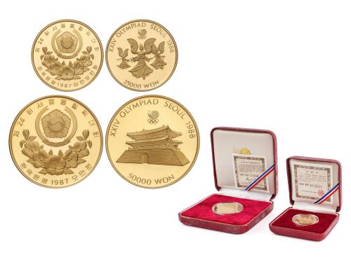 COREA DEL SUR. Lote 2 monedas 25.000 y 50.000 Won. 1987. 16,77 y 33,59 grs. AU (925). Serie II. Juegos Olímpicos Seúl´88: Baile de abanicos y Gran Puerta Sur. En estuches originales, con certificado. Fr-8, 12; KM-64, 65. PROOF.
