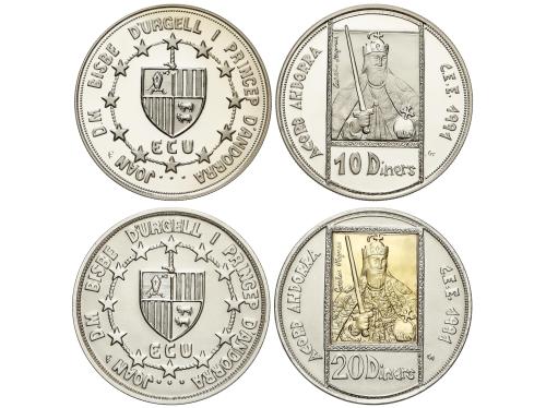 ANDORRA. Lote 2 monedas 10 y 20 Diners. 1991. 31,62 y 26,47 grs. AR,AR+AU. Carlemany. La pieza de 20 Diners contiene una plaqueta de 1,5 grs de oro AU (917). En estuche original, con certificado. KM-71, 72. FDC y PROOF.