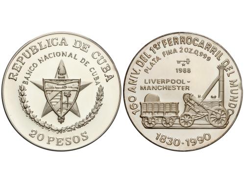 CUBA. 20 Pesos. 1988. 62,08 grs. AR. Primer ferrocarril Inglés. 2 Onzas de plata. RARA. KM-234. Tirada: 1.000 piezas. PROOF.