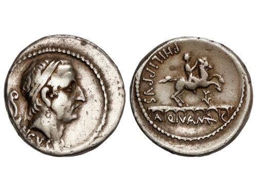 REPÚBLICA ROMANA. Denario. 56 a.C. MARCIA. C. Marcius Philippus. Anv.: Cabeza diademada de Ancus Marcius a derecha, detrás lituo; debajo: ANCVS . Rev.: Estatua ecuestre a derecha, sobre acueducto de siete arcos, detrás PHILIPPVS debajo en siete arcos A.Q.V.A.MAR.C. 3,95 grs. Cal-965; Craw-425/1; FFC-898; Se-29c. MBC+.