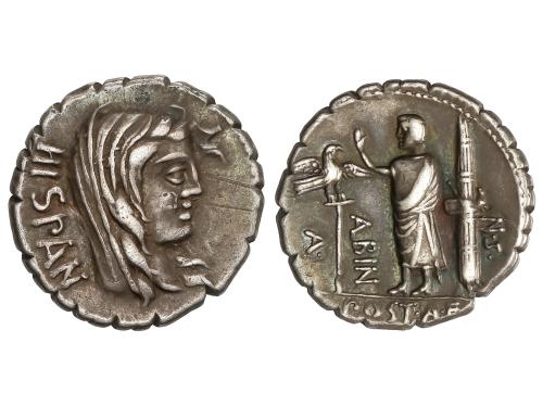 REPÚBLICA ROMANA. Denario. 81 a.C. POSTUMIA. A. Postumius A. f. Sp. n. Albinus. Anv.: Cabeza velada de Hispania a derecha, detrás HISPAN. Rev.: Personaje togado en pie a izquierda, entre águila legionaria y fasces consulares. A. POST. A. F. S. N. ALBIN. 3,90 grs. (Rayitas en anverso). Pátina. BMC-2839; Cal-1216; Craw-372/2; FFC-1072; Se-8. MBC+.