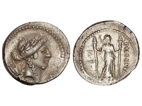 REPÚBLICA ROMANA. Denario. 42 a.C. CLAUDIA. P. Claudius M. f. Turrinus. Anv.: Cabeza laureada de Apolo a derecha, detrás lira . Rev.: Diana Lucifera de pie con dos largas antorchas. P. CLODIVS M.F. 4,05 grs. Restos de brillo original. BMC-4290; Cal-428; Craw-494/23; FFC-569; Se-15. MBC+.