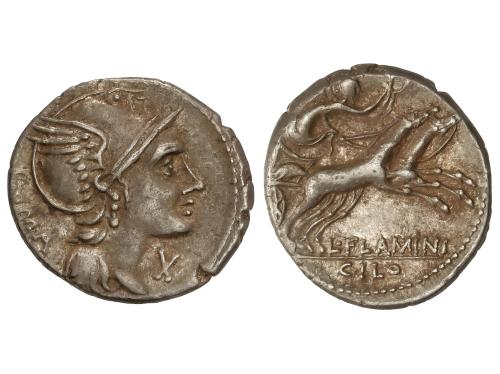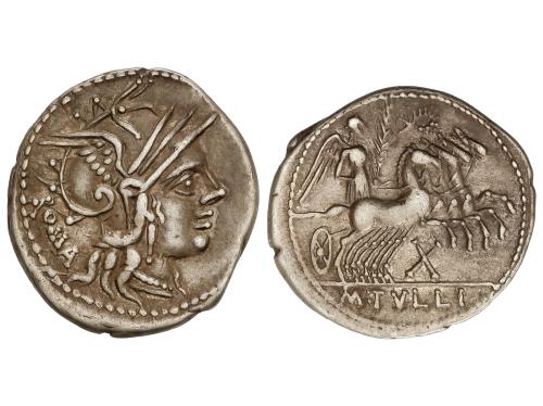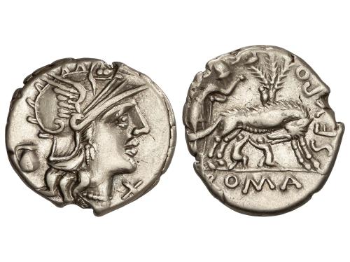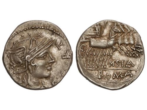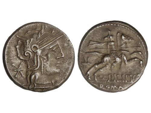 REPÚBLICA ROMANA. Denario. 116-115 a.C. CURTIA. Quintus Curtius. Anv.: Cabeza de Roma a derecha, detrás X, delante Q. CVRT. Rev.: Júpiter en cuadriga a derecha, encima lituo, debajo M. SILA. En exergo: ROMA. 4,00 grs. BMC-482; Cal-534; Craw-285/2; FFC-669; Se-2. MBC+.