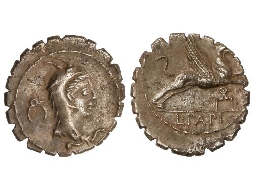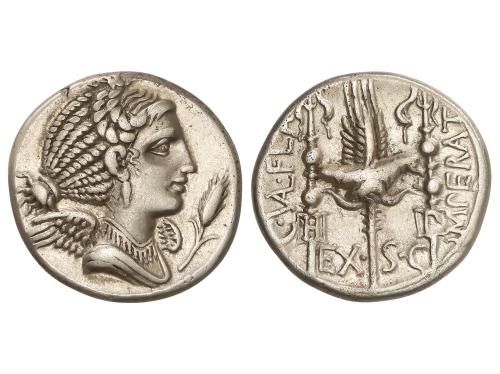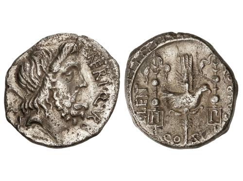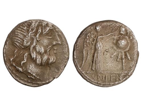 REPÚBLICA ROMANA. Denario. 49 a.C. NERIA. Cn. Nerius, L. Cornelius y C. Claudius. Anv.: Cabeza de Saturno a derecha, entre arpa y NERI. Q. VRB. Rev.: Águila legionaria entre dos insignias militares H-P. L. LENT-C. MARC: debajo COS. 3,72 grs. (Oxidaciones). BMC-3950; Cal-1047; Craw-441/1; FFC-940; Se-1. (MBC+).