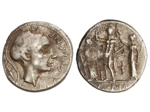 REPÚBLICA ROMANA. Denario. 112-111 a.C. CORNELIA. Cnaeus Cornelius Blasio. Anv.: CN. BLASIO. CN. F. Cabeza de Escipión El Africano a derecha, encima estrella, detrás ánfora . Rev.: Júpiter de pie de frente con lanza y haz de rayos entre Juno y Palas. En campo marca monetaria. En exergo ROMA. 3,93 grs. (Oxidaciones). BMC-622-25; Cal-471; Craw-296li; FFC-610; Se-20. MBC.