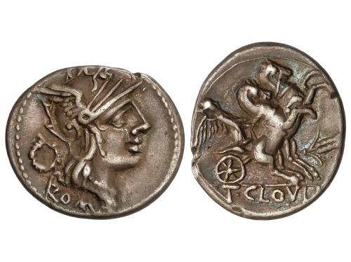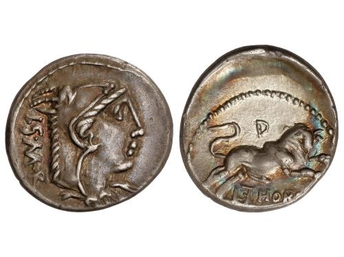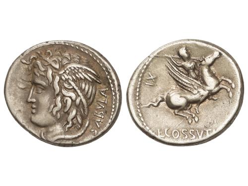 REPÚBLICA ROMANA. Denario. 74 a.C. COSSUTIA. L. Cossutius C.f Sabula. Anv.: Cabeza alada de Medusa a izquierda, detrás SABVLA. Rev.: Ballerophon montando Pegaso a derecha, a izquierda número XI, debajo L. COSSVTI. (C.F.). 3,79 grs. ESCASA. BMC-3320-28; Cal-515; Craw-395/1; FFC-655; Se-1. MBC+.