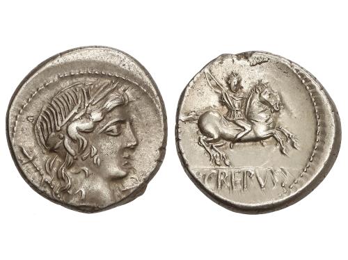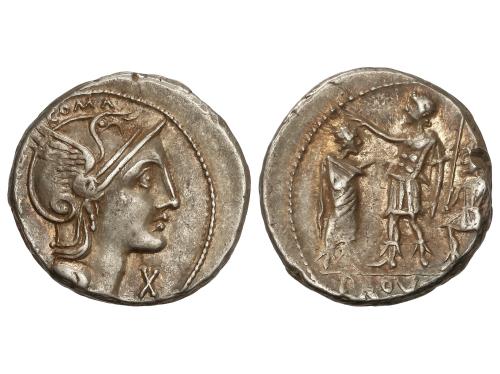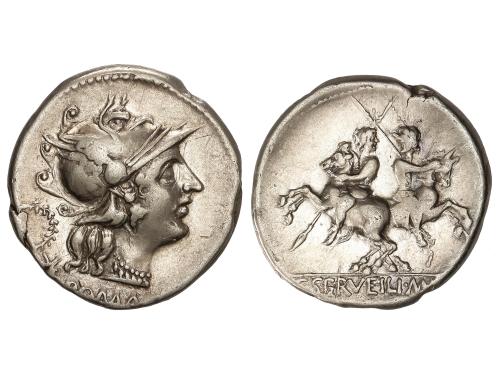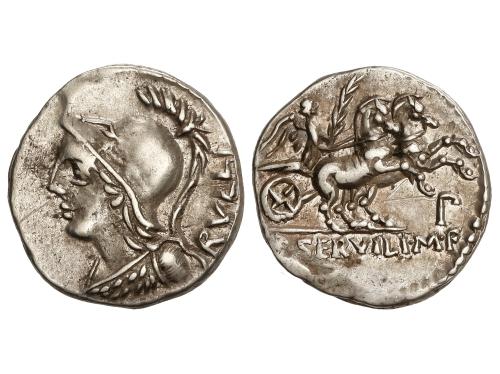 REPÚBLICA ROMANA. Denario. 136 a.C. SERVILIA. C. Servilius M. f. Augur. Anv.: Cabeza de Roma a derecha, detrás corona, debajo (ROMA y estrella). Rev.: Dioscuros galopando en sentido opuesto. En exergo: C. SERVEILI. M.F. 3,86 grs. BMC-540; Cal-1275; Craw-239/1; FFC-1116; Se-1. MBC+.