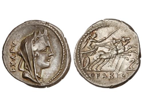 REPÚBLICA ROMANA. Denario. 104 a.C. FABIA. C. Fabius C.f. Hadrianus. Anv.: Cabeza de Cibeles a derecha, detrás EX. A. PV. Rev.: Victoria en biga a derecha, debajo cigüeña. En exergo: C. FABI. C.F. 3,93 grs. (Defecto acuñación en reverso). Pátina. Cal-575a; FFC-704. (EBC-).