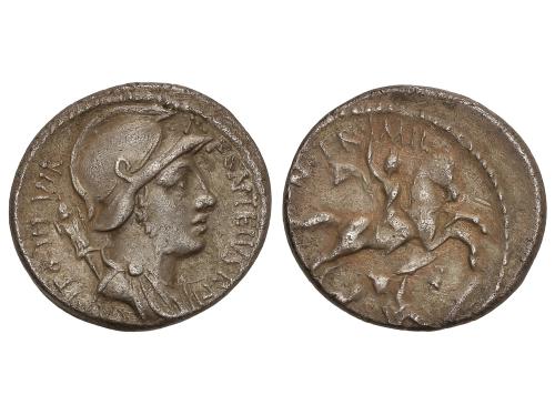 REPÚBLICA ROMANA. Denario. 55 a.C. FONTEIA. P. Fonteius P.f. Capito. Anv.: Busto de Marte a derecha, detrás trofeo. Rev.: Jinete con lanza a derecha, luchando contra dos enemigos. MN. FONT. TR. MIL. 3,81 grs. BMC-3851; Cal-594; Craw-429/1; FFC-723; Se-17. MBC+.