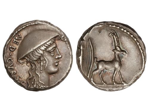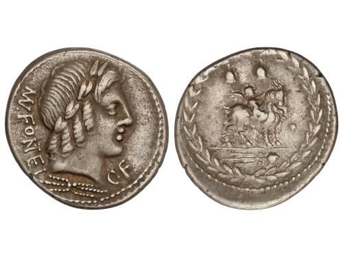 REPÚBLICA ROMANA. Denario. 85 a.C. FONTEIA. Mn. Fonteius. C.F. Anv.: Cabeza de Apolo Vejovis a derecha, entre MN. (nexadas) FONTEI (NT nexadas) y C.F. Rev.: Genio sobre cabra a derecha, debajo tirso, todo dentro de corona de laurel. 4,00 grs. BMC-2478; Cal-590; Craw-353/1c; FFC-719; Se-10. MBC+.