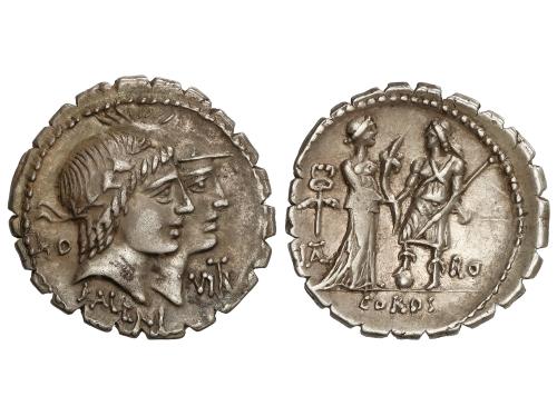REPÚBLICA ROMANA. Denario. 70 a.C. FUFIA. Q. Fufius Calenus y Mucius Cordus. Anv.: Cabezas sobrepuestas de Honus y Virtus a derecha entre HO-VIRT., debajo KALENI. Rev.: Italia y Roma de pie, entre caduceo / ITAL en monograma - RO. En exergo: CORDI. 3,77 grs. BONITA PIEZA. BMC-3358; Cal-595; Craw-403/1; FFC-725; Se-1. EBC-/EBC.