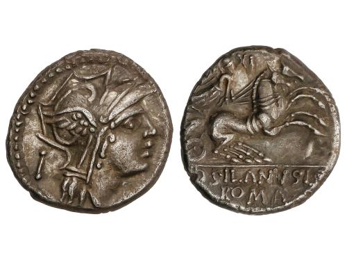 REPÚBLICA ROMANA. Denario. 91 a.C. JUNIA. D. Junius Silanus L.f. Anv.: Cabeza de Roma a derecha, detrás I . Rev.: Victoria en biga a derecha, encima número XI. En exergo: D. SILANVS. L. F / ROMA. 3,58 grs. Pátina oscura. BMC-1772-39; Cal-869; Craw-337/3a; FFC-789; Se-15. MBC+.