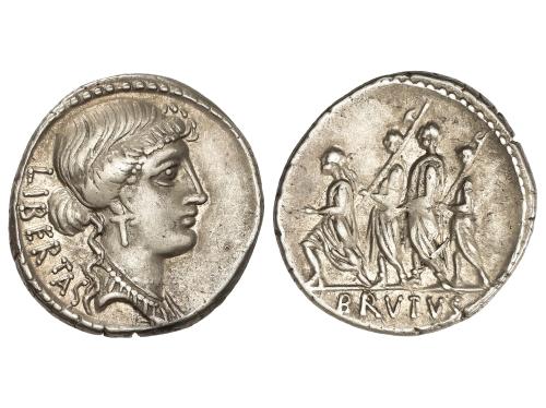REPÚBLICA ROMANA. Denario. 54 a.C. JUNIA. Q. Caepio Brutus. Anv.: Cabeza de Libertad a derecha, detrás LIBERTAS. Rev.: Accensus, dos lictores y Bruto marchando a izquierda. En exergo: BRVTVS. 3,91 grs. (Leves rayitas). ESCASA. BMC-3861; Cal-873; Craw-433/1; FFC-794; Se-31. EBC-.