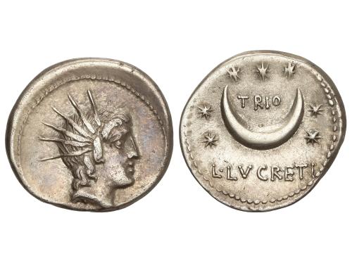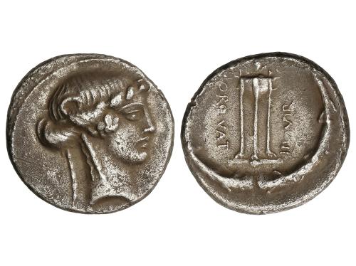 REPÚBLICA ROMANA. Denario. 65 a.C. MANLIA. L. Manlius Torquatus. Anv.: Cabeza de Sibila a derecha, debajo (SIBVLLA). Rev.: Trípode coronado por un vaso entre dos estrellas. L. TORQVAT-III. VIR. 3,56 grs. (Pequeñas oxidaciones). ESCASA. BMC-3513; Cal-929; Craw-411/1b; FFC-845; Se-12. (EBC-).