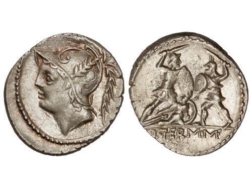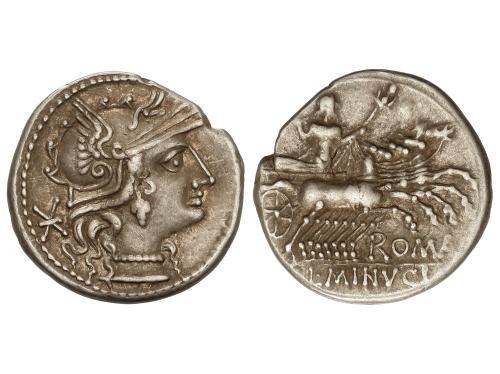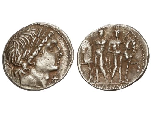 REPÚBLICA ROMANA. Denario. 109-108 a.C. MEMMIA. L. Memmius. Anv.: Cabeza masculina a derecha, delante estrella. Rev.: Dióscuros de pie sosteniendo las bridas de sus caballos. En exergo: L.MEMMI. 3,95 grs. BMC-643; Cal-980; Craw-304/1; FFC-906; Se-1. EBC-/MBC+.