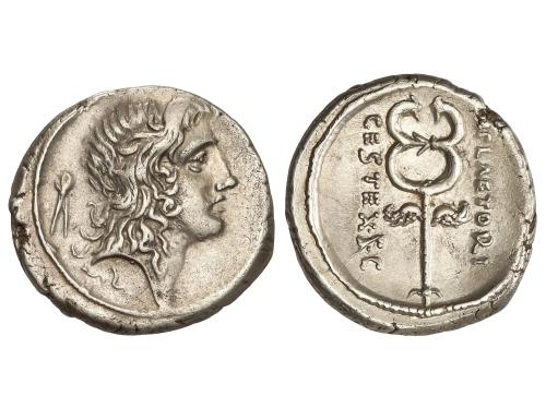 REPÚBLICA ROMANA. Denario. 69 a.C. PLAETORIA. M. Plaetorius M.f. Cestianus. Anv.: Cabeza de Bonus Eventus joven a derecha, detrás símbolo. Rev.: Caduceo alado entre M. PLAETORI y CEST. EX. S.C. 3,98 grs. Restos de brillo original. BMC-3554-73; Cal-1107; Craw-405/5; FFC-972; Se-5. (EBC-).