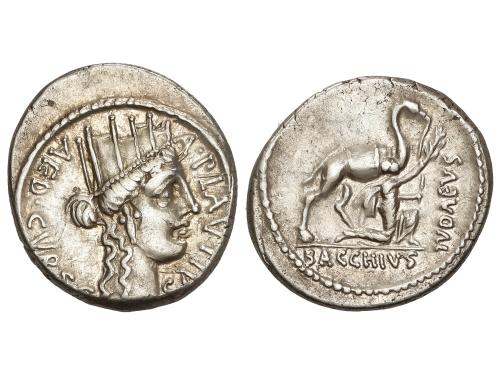 REPÚBLICA ROMANA. Denario. 79 a.C. PAPIA. L. Papius. Anv.: Cabeza de Juno Sospita a derecha, tocado con piel de ciervo, detrás calibre. Rev.: Grifo a derecha, debajo divisor. En exergo: L. PAPI. 3,53 grs. Par de símbolos nº 163 de Crawford. (Leves oxidaciones). Pátina. BMC-2977-95; Cal-1057; Craw-384/1; FFC-952; Se-1. MBC+.