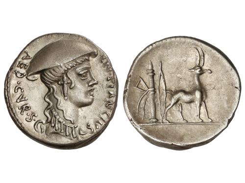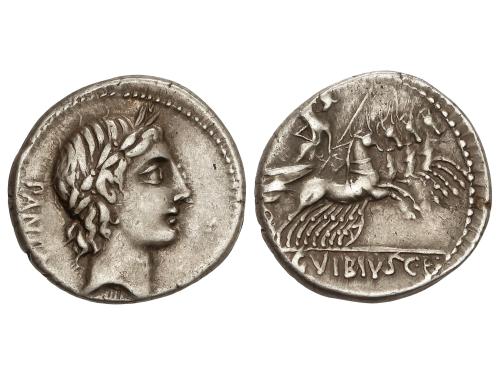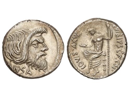 REPÚBLICA ROMANA. Denario. 48 a.C. VIBIA. C. Vibius C.f. C.n. Pansa. Anv.: Máscara de Pan a derecha, debajo PANSA. Rev.: Júpiter Axur sentado a izquierda con pátera y cetro. IOVIS. AXUR. C. VIBIVS. C.F.C.N. 4,09 grs. ESCASA. BMC-3978; Cal-1371; Craw-449/1a; FFC-1219; Se-18. EBC/EBC-.