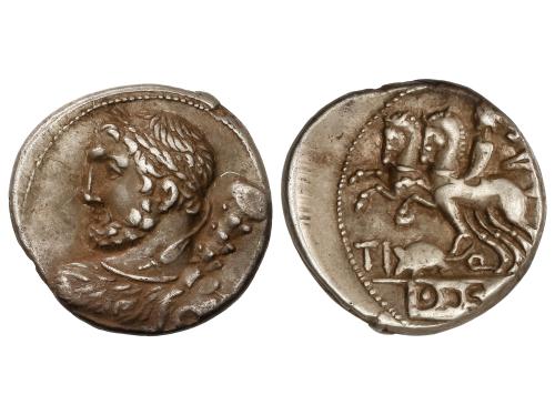 REPÚBLICA ROMANA. Denario. 112-111 a.C. QUINCTIA. Ti Quinctius. Anv.: Busto de Hércules a izquierda, maza sobre su hombro. Rev.: Jinete con un segundo caballo a izquierda, debajo rata a izquierda entre TI - Q. En exergo: D. S(. S). 3,83 grs. Pátina. FFC-1086. MBC+.