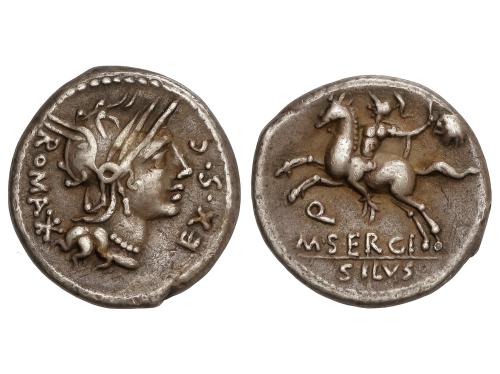 REPÚBLICA ROMANA. Denario. 116-115 a.C. SERGIA. M. Sergius Silus. Anv.: Cabeza de Roma a derecha, entre ROMA / * y EX S. C. Rev.: Jinete a izquierda, detrás cabeza de galo. Debajo: Q / M. SERGI. En exergo: SILVS. 3,80 grs. Pátina. BMC-517; Cal-1271; Craw-286/1; FFC-1111; Se-1. MBC+.