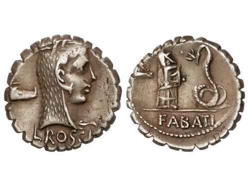 REPÚBLICA ROMANA. Denario. 64 a.C. ROSCIA. L. Roscius. Anv.: Cabeza de Juno Sospita tocado con piel de cabra a derecha, debajo L. ROSCI. Rev.: Mujer dando de comer a una serpiente. En exergo: FABATI. 4,00 grs. Par de símbolos no catalogados en Crawford. BMC-3394-10; Cal-1231; Craw-412/1; FFC-1090; Se-3. MBC+.