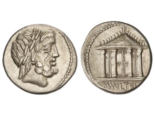 REPÚBLICA ROMANA. Denario. 78 a.C. VOLTEIA. M. Volteius M.f. Anv.: Cabeza de Júpiter a derecha. Rev.: Templo tetrástilo de Júpiter Capitolino, haz de rayos en el frontón. En exergo: M. VOLTEI. M.F. 3,59 grs. (Marca de cambista). BMC-3154; Cal-1396; Craw-385/1; FFC-1234; Se-1. MBC+.