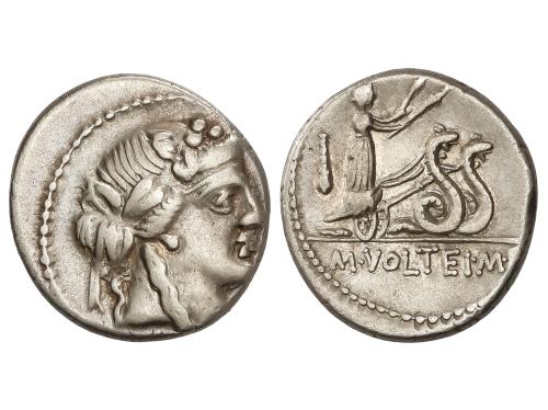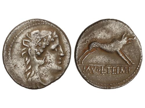 REPÚBLICA ROMANA. Denario. 78 a.C. VOLTEIA. M. Volteius M.f. Anv.: Cabeza de Baco a derecha. Rev.: Ceres con dos antorchas en biga arrastrada por serpientes a derecha, detrás garrote. En exergo: M. VOLTEI. M. F. 4,05 grs. ESCASA. BMC-3160-78; Cal-1393; Craw-3855; FFC-1231; Se-3. MBC+. Ex Martí Hervera - 15 noviembre 2005, n. 229.