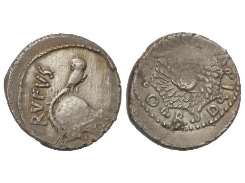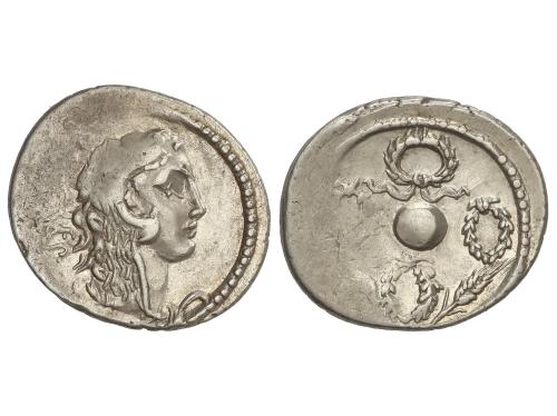 REPÚBLICA ROMANA. Denario. 46 a.C. CORDIA. Manius Cordius Rufus. Anv.: Casco corintio, encima lechuza, detrás RVFVS . Rev.: Égida de Minerva con cabeza de Medusa en el centro, alrededor MN. CORDIVS. 4,04 grs. Leve pátina. BMC-4042; Cal-464; Craw-463/2; FFC-601; Se-4; S.Domingo-181. MBC+.
