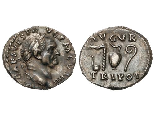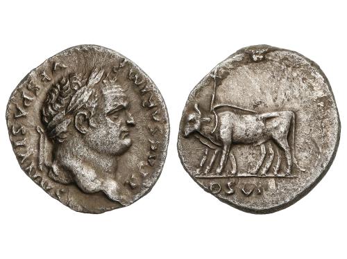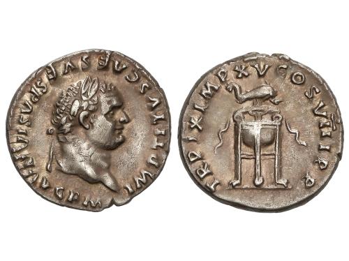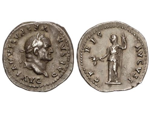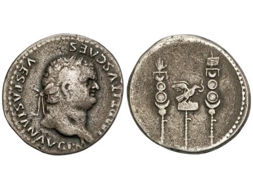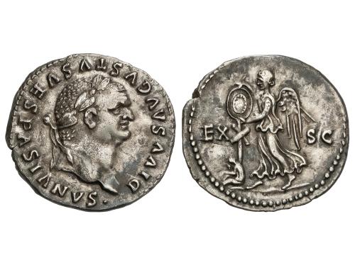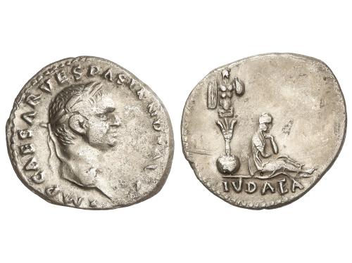 IMPERIO ROMANO. Denario. 80-81 d.C. VESPASIANO. Anv.: DIVUS AVGVSTVS VESPASIANVS. Cabeza laureada a derecha. Rev.: EX S.C. Victoria en pie a izquierda erigiendo trofeo, a lo pies cautivo judio. 2,97 grs. (Leves oxidaciones). Pátina. C-144; RIC-T59a; BMC-T112. EBC-.