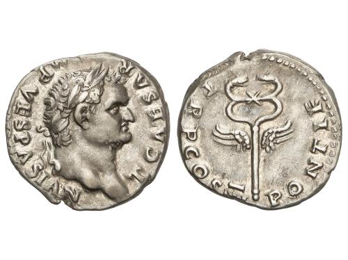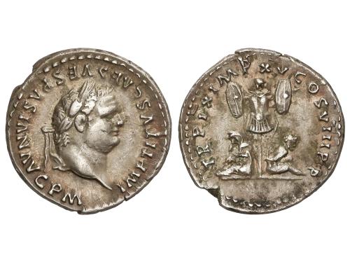 IMPERIO ROMANO. Denario. 79-81 d.C. TITO. Anv.: IMP. TITVS CAES. VESPASIAN AVG P. M. Busto laureado a derecha . Rev.: TR. P. IX IMP. XV COS VIII P P. Trofeo entre Britannia sentada a la izquierda en actitud de duelo y un cautivo británico sentado a la derecha con las manos atadas. 3,37 grs. Ligera pátina. BMC 37; C-306; RIC-102. MBC+.