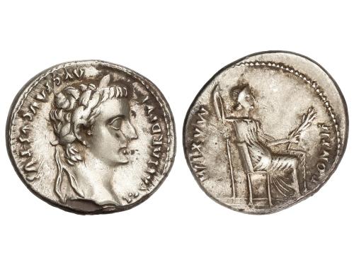 IMPERIO ROMANO. Denario. 7-6 a.C. AUGUSTO. LUGDUNUM (Lyon). Anv.: CAESAR AVGVSTVS (DIVI F. PATER. PATRIAE). Cabeza laureada a derecha. Rev.: CL. CAESARES AVGVSTI (F. COS. DESIG. PRINC. IVVENT.) Cayo y Lucio César, entre ellos símpulo y lituo. 3,93 grs. C-43; Cal-852; FFC-22. MBC+.